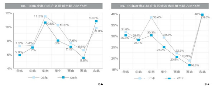 據統計,2009年度中,在“龍之夢”等項目的帶動下,東北市場成為離心機市場中的異類,繼續保持了一定幅度的增長,而華東、華北、華南、華中、西北、西南六大區域離心機市場規模分別出現了不同程度的下滑,其中經濟**為發達、市場整體規模**大華東地區自身規模下滑**大,同時,大部分地區離心機市場在區域整體市場中的占比(圖8),以及離心機在區域冷水機組市場中的占比也都出現下滑(圖9),也再次說明了離心機市場整體下滑**直接的原因來自市場外部經濟環境的影響。然而,各區域自身規模的變化并沒有給其在離心機市場占比帶來明顯的影響,華東、華南、華北三大市場依然是離心機市場的主角,占比均超過了20%,其他幾大區域依然維持在10%之下(圖10)。這也印證了離心機市場的發展規律與區域經濟發展狀況的密不可分。在這樣的情況下,相信離心機市場的區域分布格局也將比較穩定。