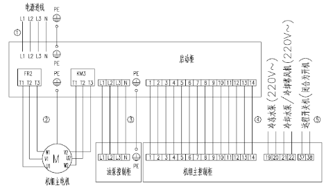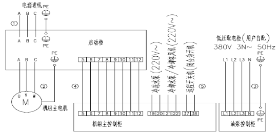 1、線①為從客戶配電柜**啟動柜的電源線(三相帶零線、地線),要求電源規格為380V 3N~ 50Hz。電源線從啟動柜上端進入,線徑要求隨機組功率調整。