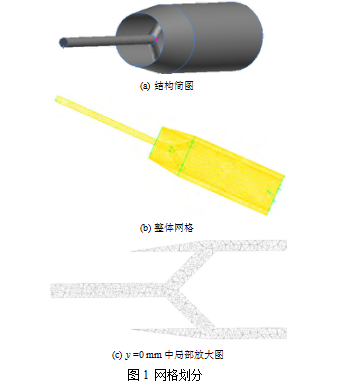 目前 Gambit 尚無法直接建立對應(yīng)的幾何模型,因此在模擬中shou先將各部分簡化,即不考慮螺旋的作用建立三維模型,然后讀入 Gambit 進(jìn)行網(wǎng)格劃分,采用 T-Grid 方法創(chuàng)建非結(jié)構(gòu)化網(wǎng)格如圖 1 所示,其中圖 1a 為所建模型的結(jié)構(gòu)簡圖,圖 1b 所建流場整體網(wǎng)格劃,圖 1c 為