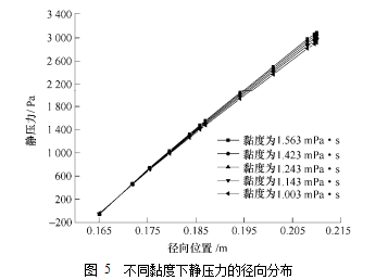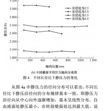 明增加液環(huán)層的厚度靜壓力值會(huì)顯著增大。當(dāng)長徑比從 2.5 增大到 3.5 時(shí),同一徑向位置處的靜壓隨著長徑比的增大而減小,說明此時(shí)增大長徑比可以減小阻力損失。但是進(jìn)一步增大長徑比,即長徑比由 3.5 增大到 4.0 時(shí),同一徑向位置處的靜壓隨著長徑比的增大而迅速增大,說明此時(shí)增大長徑比將增加阻力損失。從圖 4b 中截面平均壓力沿軸向的分布可以看出,同一長徑比下截面平均壓力沿軸向的變化不大,但是同一軸向位置處截面平均壓力隨長徑比的變化較大,隨長徑比壓力的變化與徑向分布規(guī)律類似。